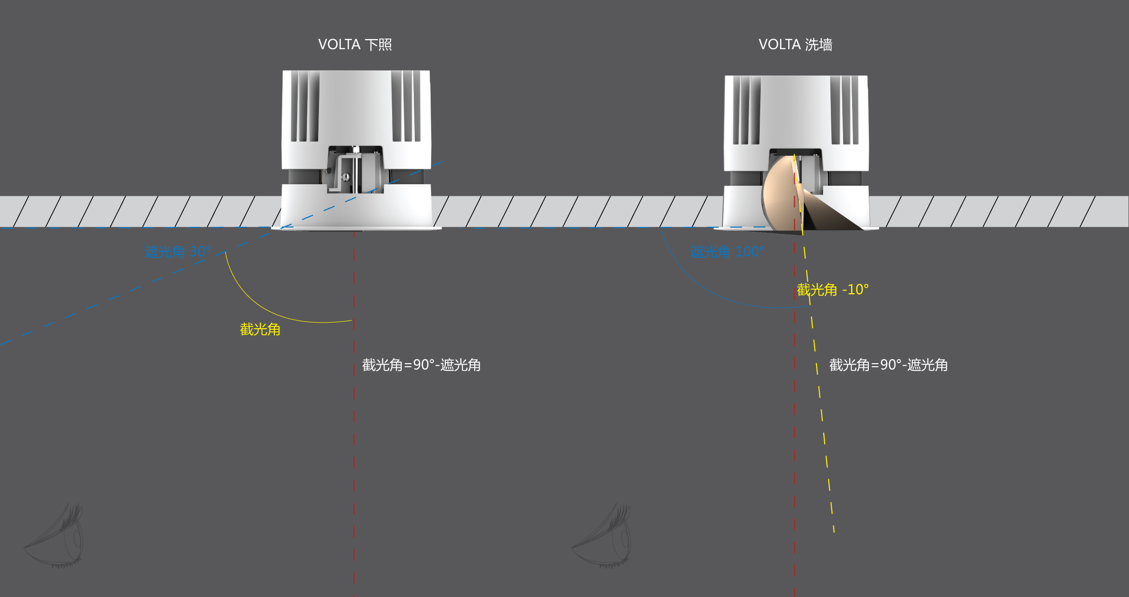VOLTA洗墻系列燈具所引入的“負截光角”理念,它不僅僅是簡單地限制光線的擴散,而是通過更為復雜和精細的光學設計,實現(xiàn)了“-10° 截光角”,確保了光線在投射過程中的最大化輸出,減少光損,確保照明的質量,同時在最大范圍內保證了人眼不會受到直接眩光的影響。